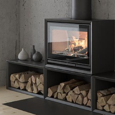 | A range of stoves that can be customised to any taste and home. The cube-shaped Contura 300 range offers a multitude of variations. Its wide-screen-window displays the fire in all its glory, the log box can be placed either side of the fireplace, and the firebox takes logs 1/2 metre long. |