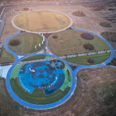 | A new community leisure and recreational space was planned as part as part of the regeneration of the former Ravenscraig steel works. The striking geometric design, based on a series of circles, incorporated a play area, sports facilities, sensory garden and visitor hub. |