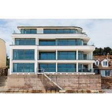 | Layered recessed glazed facades, created using TECHNAL aluminium systems, maximise occupant views and deliver a sleek seafront architectural focus for new, luxury apartments overlooking the beach at Gorey in Jersey. Designed by Morris Architects. |