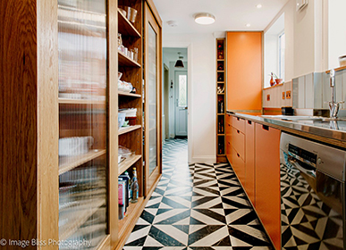 GEC Anderson were commissioned to measure, manufacture and install custom brushed stain stainless steel worktops for this bright modern contemporary kitchen. Featuring prominent orange cabinets, manufactured by Quirky Carpentry and brightly glazed floor tiles, the stainless steel worktops complement the kitchen beautifully.