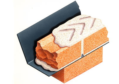 Optimum placement position: The flat bed of the Pyramid Weep provides the evacuation route at the lowest position relative to the mortar bed. It is sufficiently compact to permit incorporation within a bed course. The bed course position should coincide with a perp joint where the dimensions are particularly fine this permits the triangle to extend into the perp.
