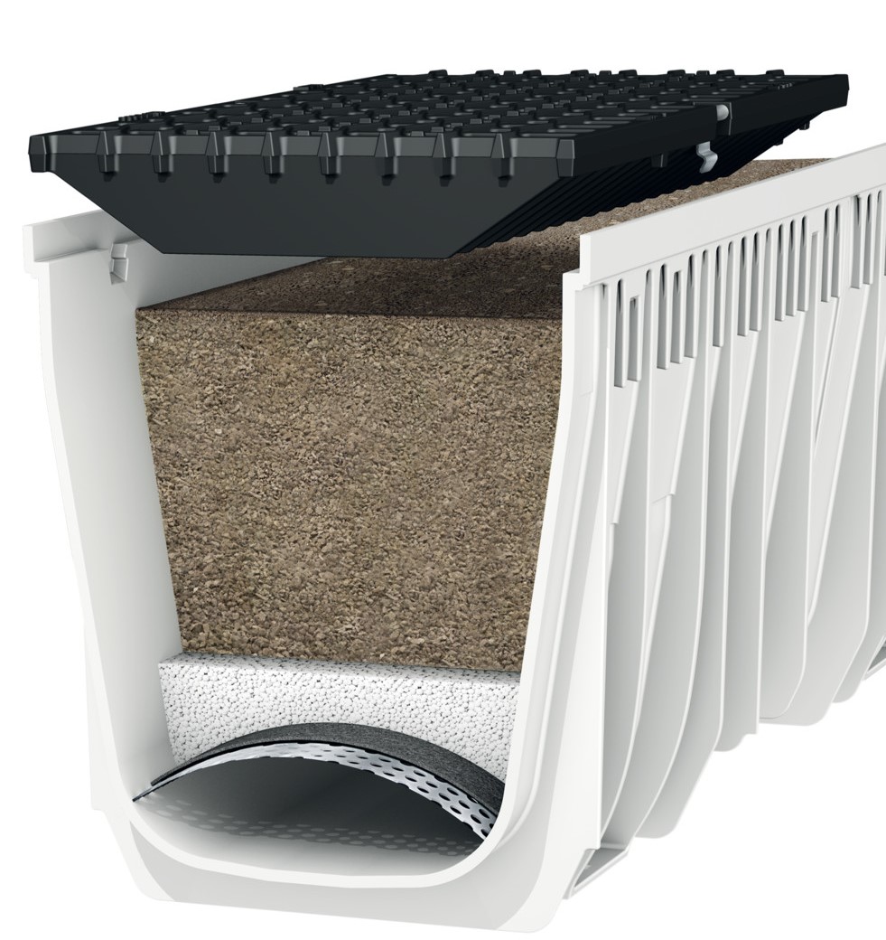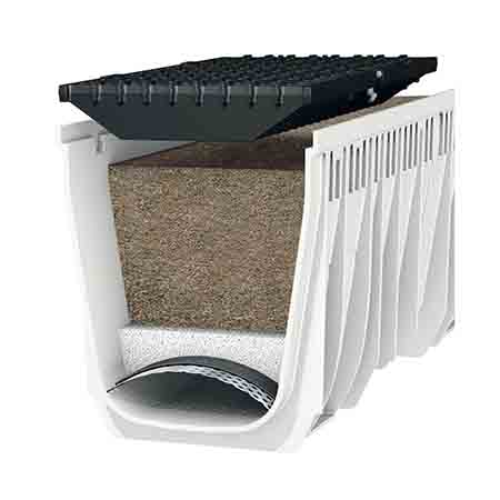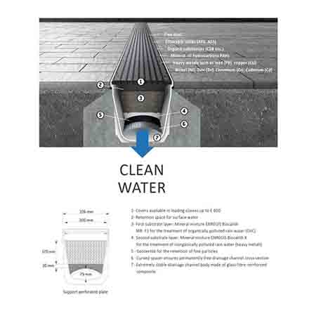 Inside the drainage channel, the system uses several layers of natural mineral filters:
