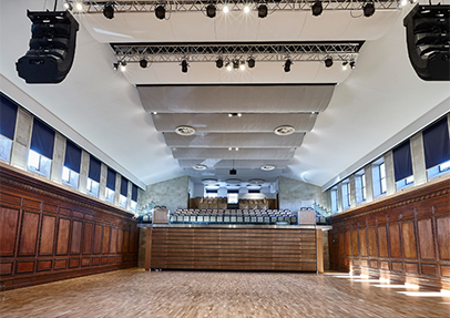 On the remaining hall ceiling we custom made fabric covered ceiling screens with apertures for ventilation access and fitted RG Monoradial over the front stage area. GRG made a selection of bespoke round or rectangular RPG Absorbers in white for the ceilings, some forming clusters or spaced evenly. The round absorbors were 1400mm wide. Bespoke ceiling RPG Absorbers to compliment the area. Rectangular bespoke ceiling RPG Absorbers incorporating spotlights and apertures were used for ventilation grills. Two feature walls were created with our white acoustic RPG Harmonix G panels, this provided an acoustic and aesthetic solution for the whole area.