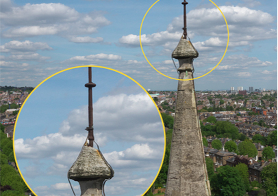 A recent aerial survey by Overdrones on a church in North London has revealed missing stonework right at the top of the spire - where the lightning conductor meets the weather vane - previously invisible to even the most powerful binoculars.