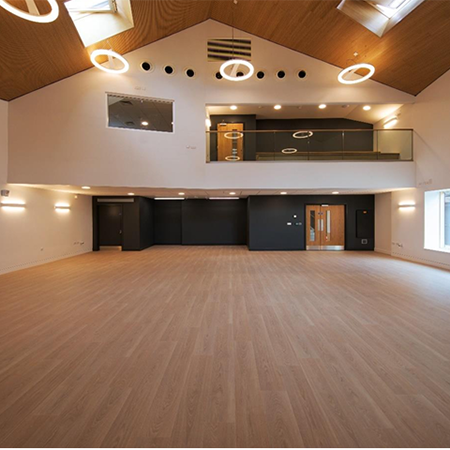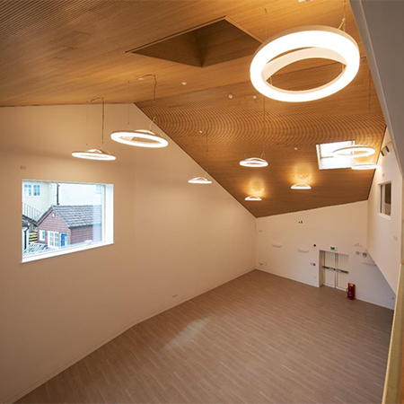 This new Performing Arts Studio designed by Ellis Williams Architects offers a large double height space capped off by our Topakustik 14/2M (aw.0.90, Absorption Class A, NRC 0.89) system. Installing the Class A sound absoring product in an Oak veneer not only looks good but creates a warmth whilst bringing great acoustic design into the project. Installed by G&E Projects on behalf of the main contractor Neilcott Construction, our Topakustik system helped to achieve the BB93 reverberation regulations bringing the reverberation of the sound to below 1.2 seconds.