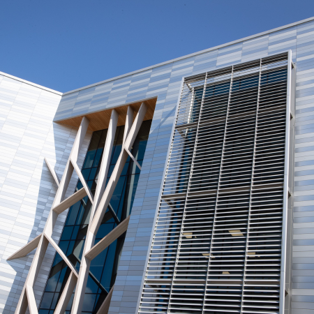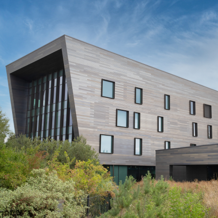 The cool tone of Aliva’s anthracite grey anodised aluminium Alu.covering® system created a randomised/interspersed panel effect. It created a sense of shimmer on the exterior, as the sun moves over the building and the light dances across the panels from different angles, creating the visual intrigue that complements a tech brand of this high calibre.