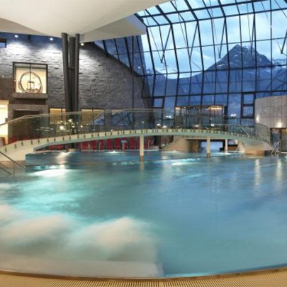 The entrance to the large thermal hall surprises the visitor - as they gain the impression of having walked into a dome. The imposing waterfall, the two internal pools with water temperatures of 34 and 36 degrees Celsius, the quiet rooms arranged like opera galleries, and the view through the glass facade to nature itself is simply magnificent. A solarium, various heated zones, and restaurants and shops complete the numerous internal options available. Two rivers flow out into the open-air spring and to an illuminated and heated glass crystal. From here one can gain access to the three pools, hovering on stalks.