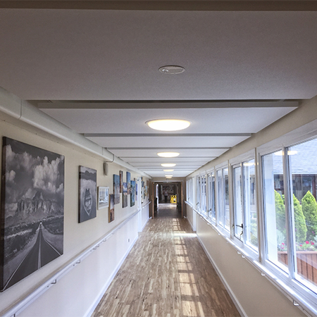 Some 240 Optima L white mineral canopies were retro-fitted by Mitie Technical Facilities Management throughout the corridors in the home in Porthcawl near Cardiff. The brief from the Royal Masonic Benevolent Institution Care Company, a registered charity, was to raise the quality of the ceiling finish without losing access to the existing installations that were surface mounted as well as delivering this in a cost-effective way.