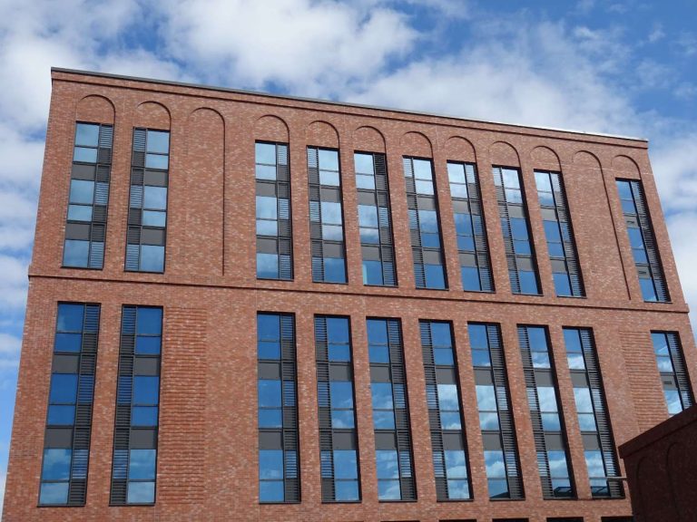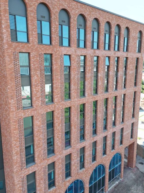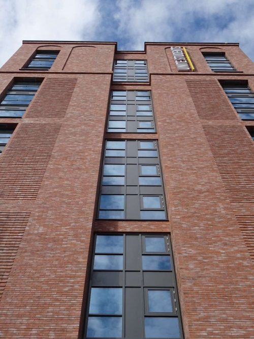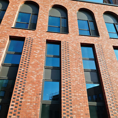 The AlivaBrick system has realised a series of grand sweeping brick slip archways crowned with soldier bonds, that take the eye from ground to sky. They sit alongside a mix of intricate laddering details with shadow effect created from black slips, recesses, step outs and projecting banding serving as a subtle complement to the larger detailing. These all blend together to create architectural intrigue and flair alongside an aesthetic that evokes the city’s urban heritage.