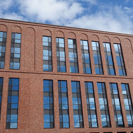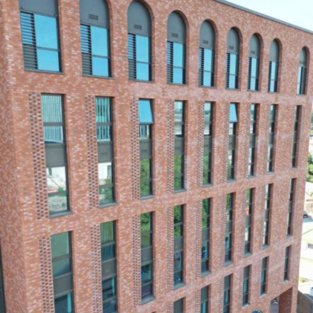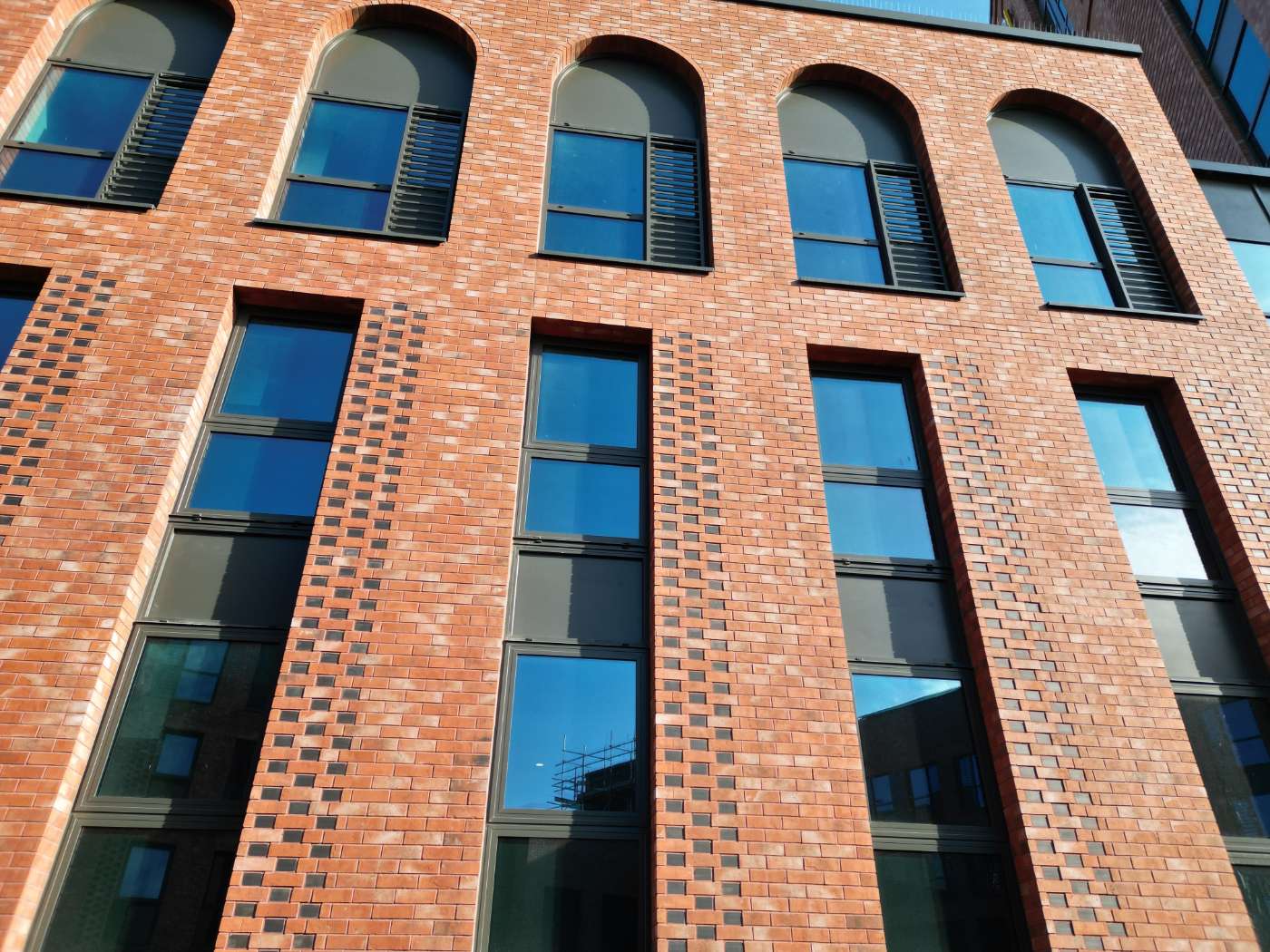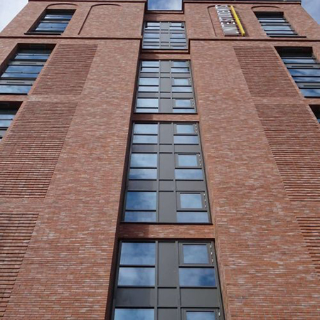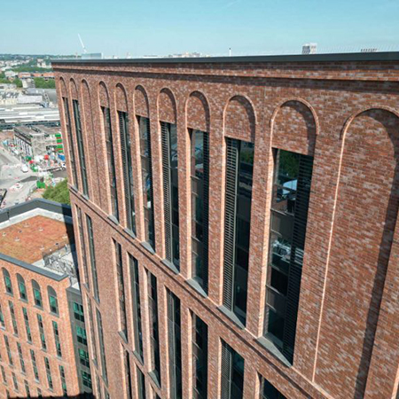 The system features 7,000sqm of EWI AlivaBrick, which demonstrates the architectural impact it can have used at scale to make a statement impression on a city skyline. The system includes 15mm red multi slips and 9mm black slips for accent detailing/shadow effects, with two thicknesses of mineral wool insulation used.