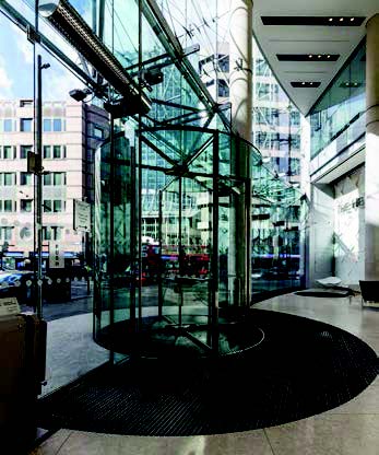 The office entrance foyer is a double volume space, some 9m high, enclosed externally by a suspended curved steel and glass façade, forming a triple-glazed void 2m deep for the height of the building, which acts as a thermal flue. In conjunction with Scheldebouw, Middelburg, the Netherlands, part of the Permasteelisa Group, Bauporte Doors UK LTD developed fully glazed revolving doors, Circular Full Vision 3000 MX.