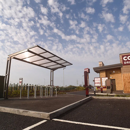 Working with Readie Construction, Broxap's Coventry Cantilever Cycle Shelter was installed along with Sheffield Cycle Stands to encourage people to use bicycles as a mode of transport. Powder coated in Anthracite Grey (RAL 7016) for a sleek and modern look, the canopy provided a sheltered and convenient place for people to park their bikes while shopping or running errands.