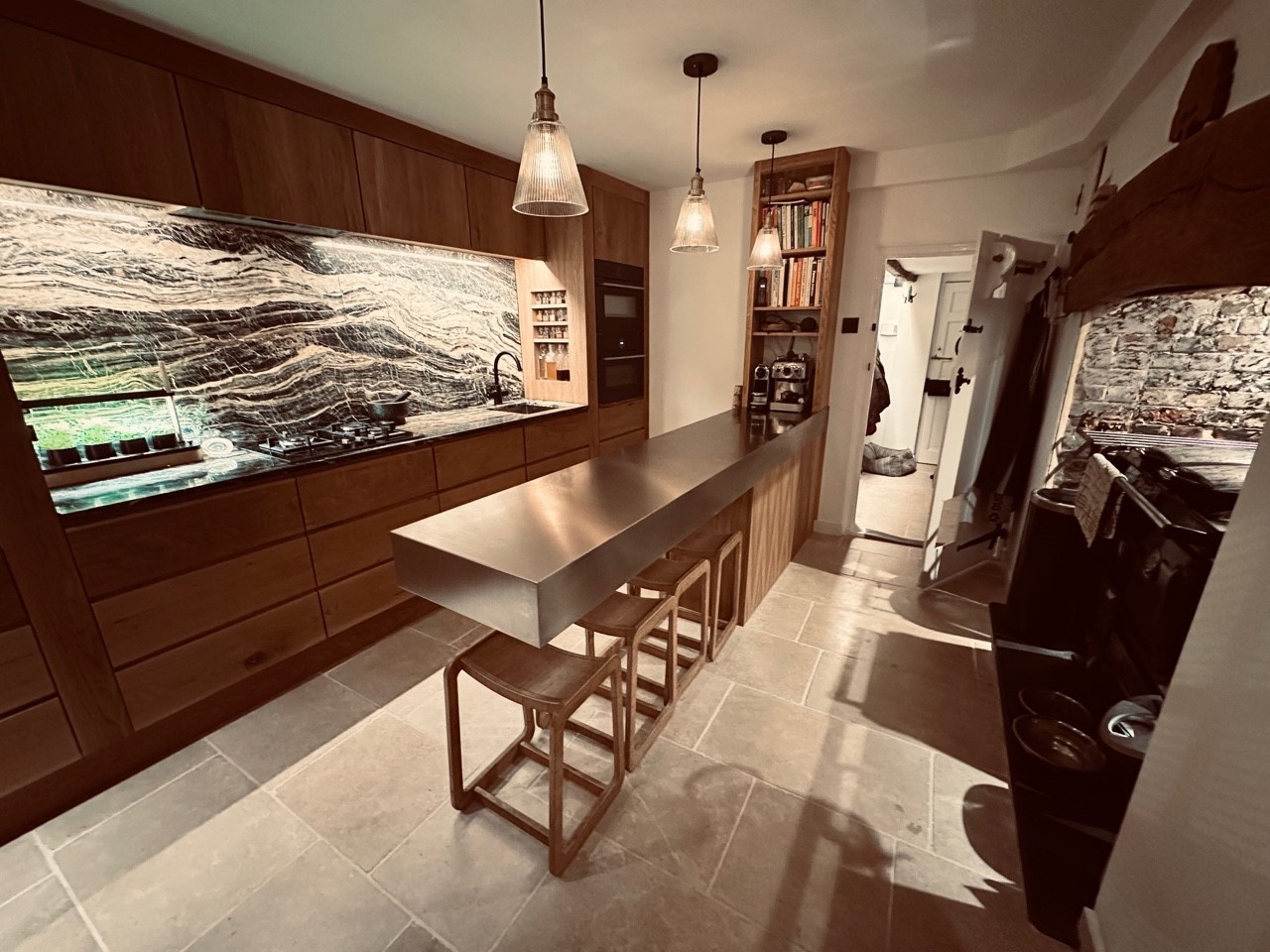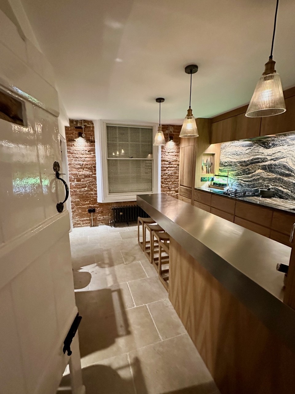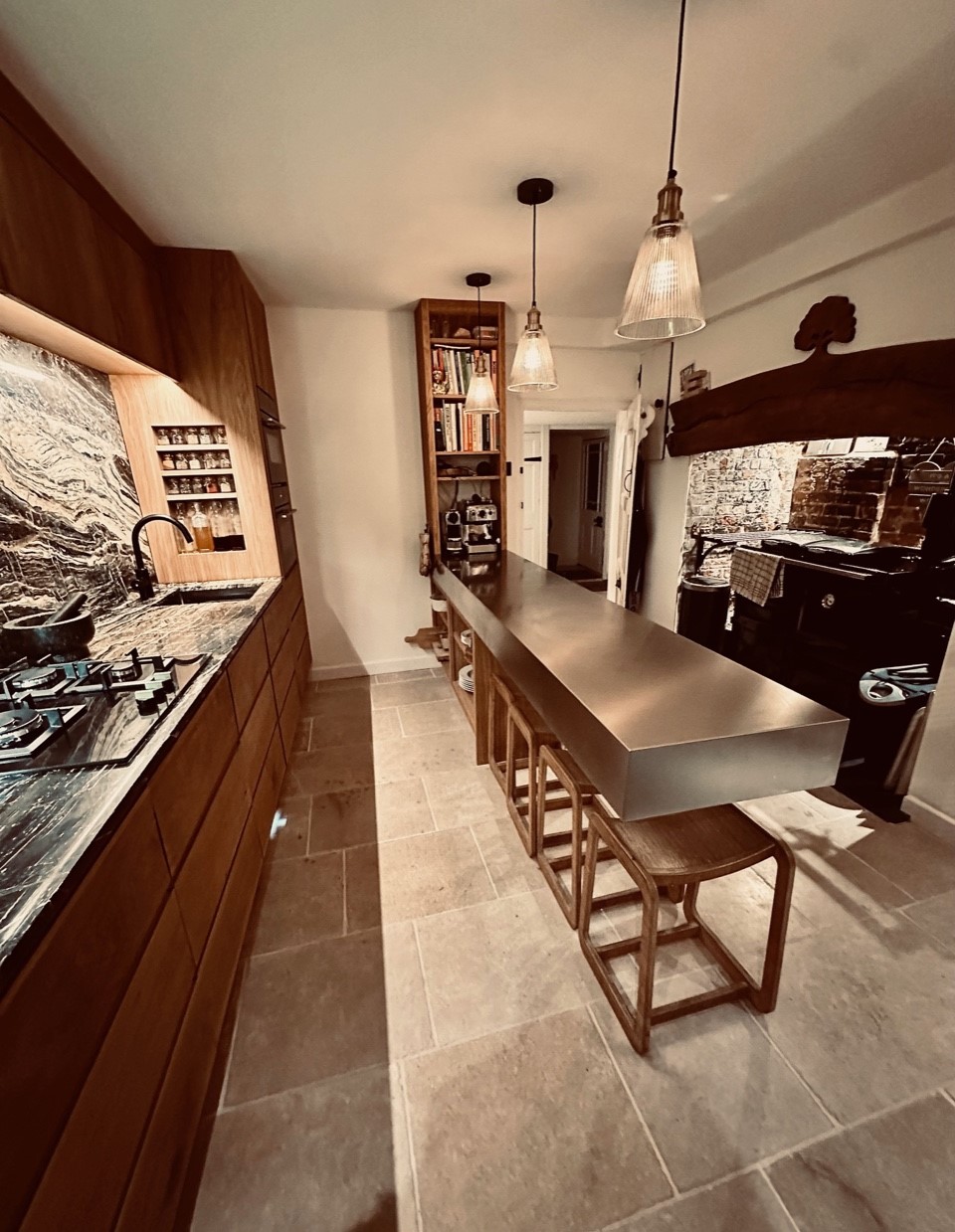 The stainless steel ‘butchers block’ worktop was made to measure and is nearly three metres in length. GEC Anderson edge (7) was specified with a depth of 160mm to give the ultra solid look for the peninsular surface that acts as a breakfast bar as well as a general worktop in the centre of the kitchen.