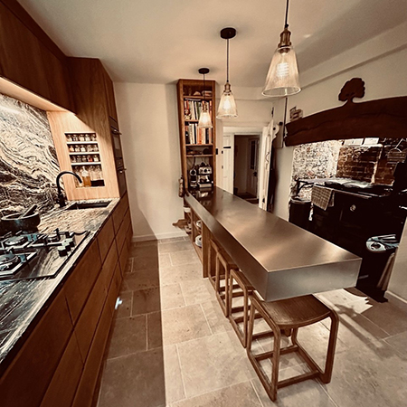 GEC Anderson were commissioned to manufacture a brushed satin stainless steel gallery worktop for this stunning Hampshire kitchen.
