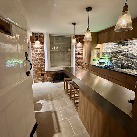 The customer was delighted “The kitchen is finished. The stainless steel worktop is the crowning glory, a piece of beauty!” The worktop was made from GEC Anderson’s EN 1.4301 grade brushed satin stainless steel.