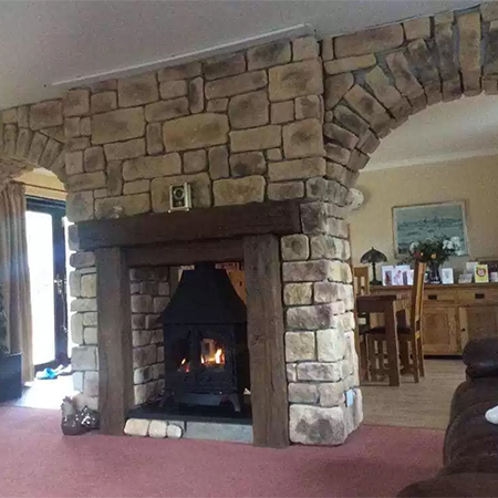 Higgins Cladding has provided its Golden Sandstone Cast Stone Cladding for a fireplace and adjacent arches. This stone cladding is manufactured in the UK. Higgins Cladding use a process that replicates existing colours and textures of traditional stone.