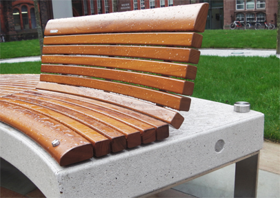 Artform Urban Furniture approached the landscape architects and the University facilities team with a number of proposed options to resolve this budget issue. A standard, but flexible product range in the curved Diamante seat was arranged with a bespoke hardwood timber seat pattern to sit on white granite seats complete with stainless steel supports.