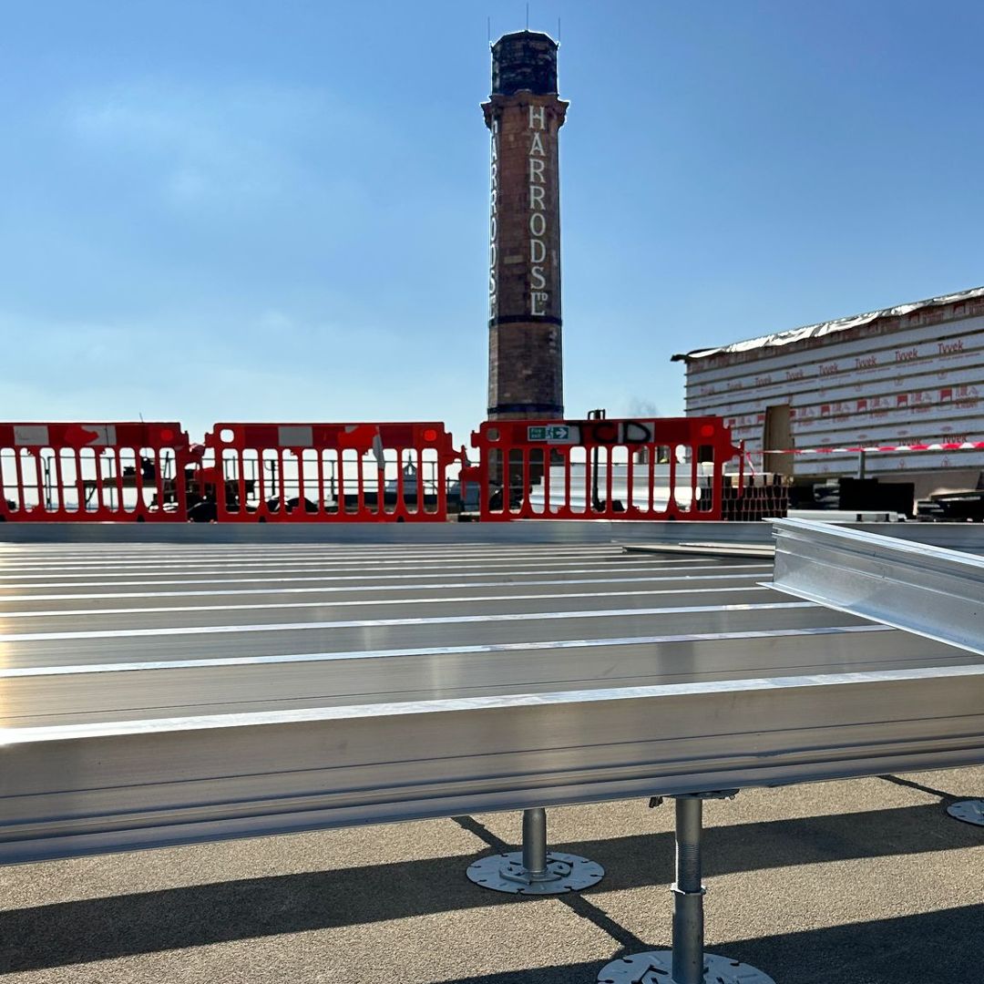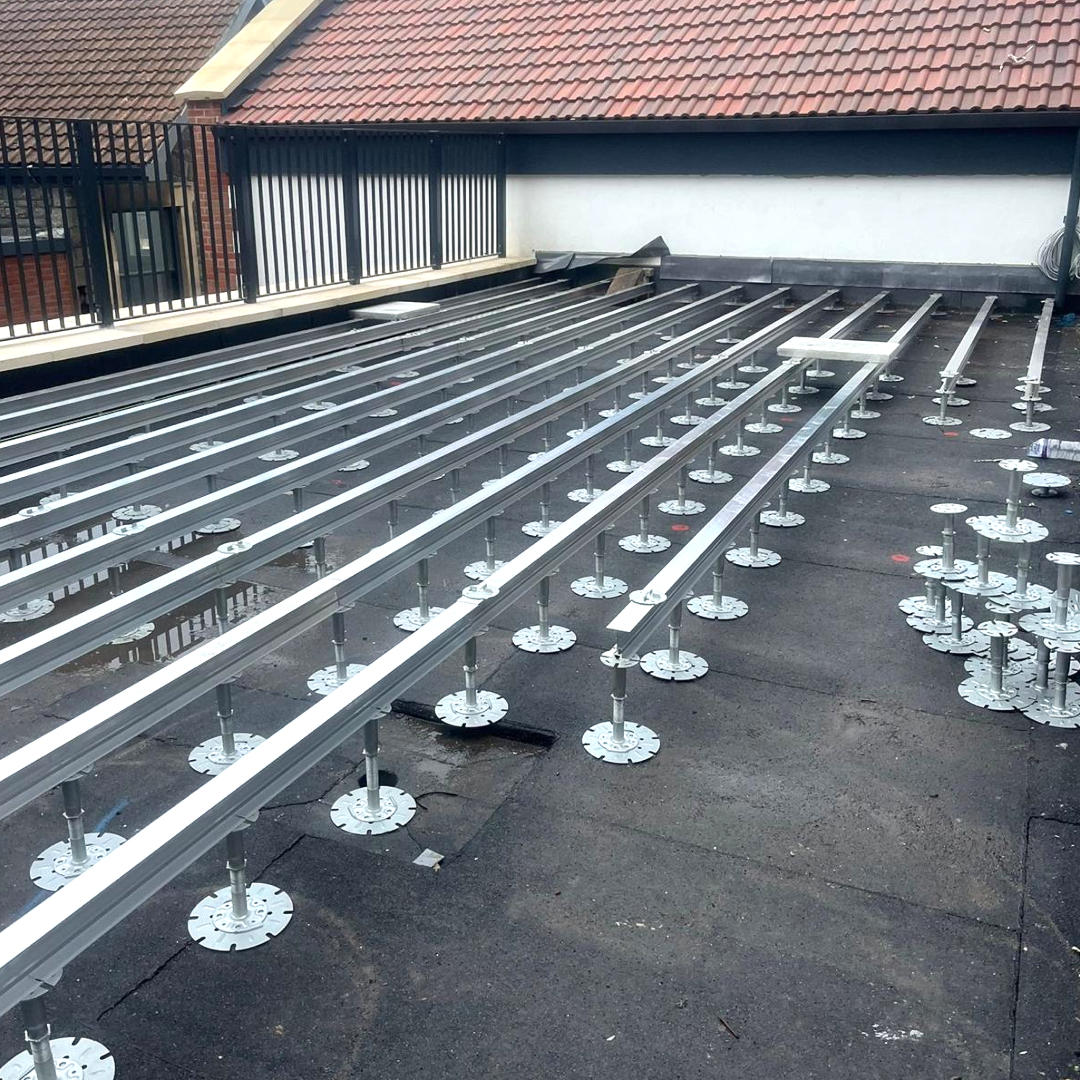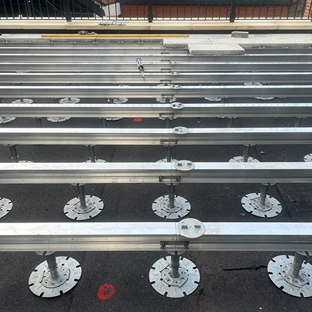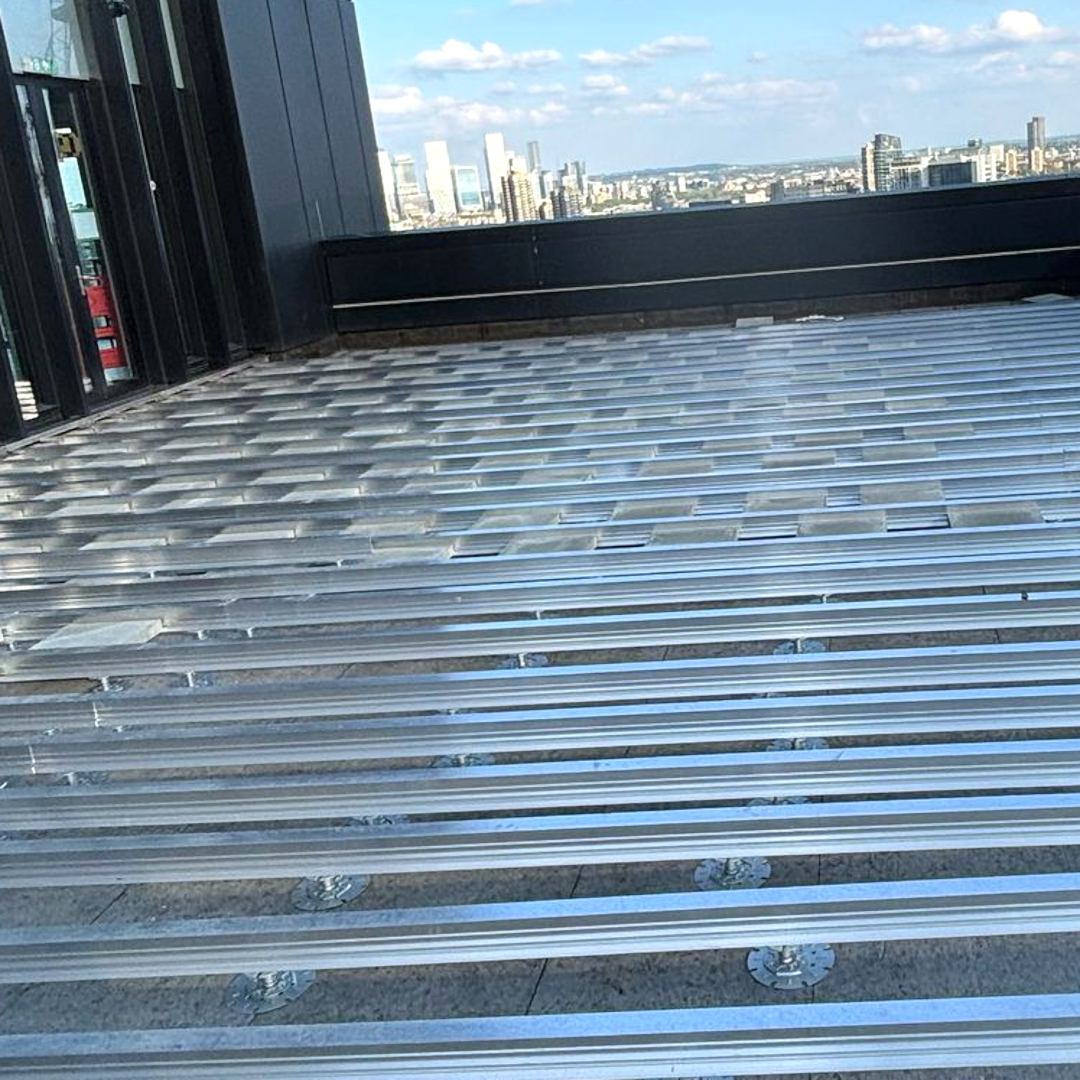 A complete aluminium joist and MetalPad Ex pedestal assembly for non-combustible paving and decking systems. Rails are connected via wing nut and bolt fixing for rapid, adjustable installation. Fully compliant and ideal for new build & retrofit projects with fire safety requirements.