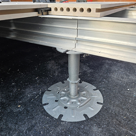 100 percent metal Class A adjustable pedestals supporting the full range of aluminium rails and joists. The range covers heights from 26mm to 375mm and have a Zintec 200 coating for external durability. Provides a stable, load-bearing platform for decks and paving.