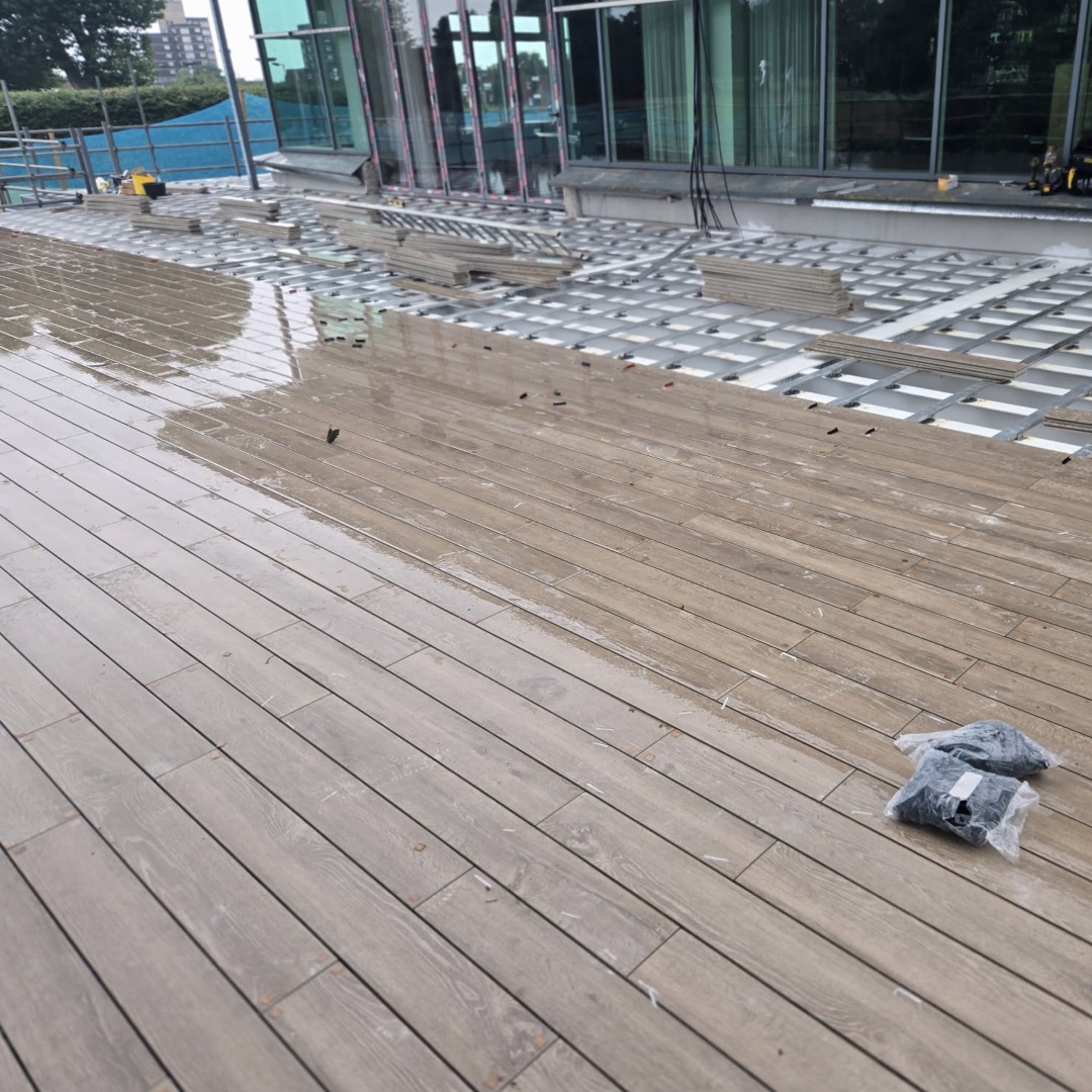 The terrace was finished with Exadeck porcelain decking in a Teca tone, including bull nosed boards to detail the perimeter and matching step tiles on the new external staircase. The result is a precise, compliant and visually luxurious elevated terrace built for long term use at a landmark London venue.