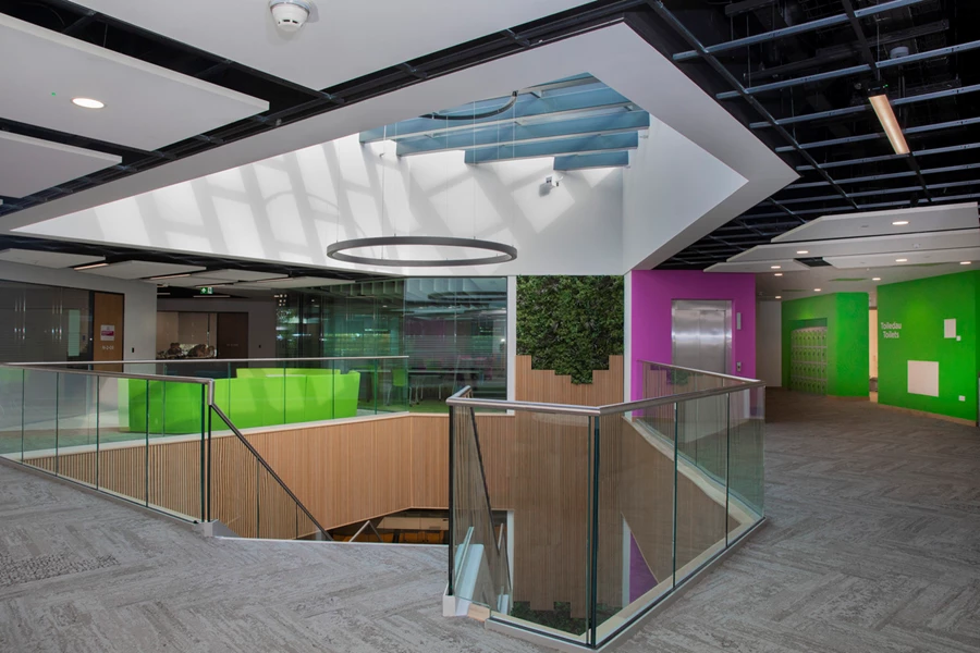 Coleg Cambria's Yale campus in Wrexham, North Wales, has undergone a major transformation in the last two years. The new building includes an atrium, space for socialising, study areas, teaching rooms and administration facilities.