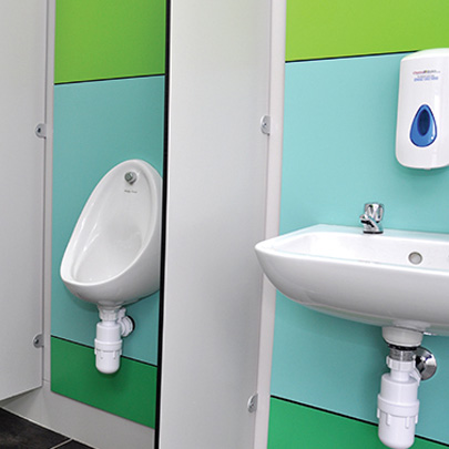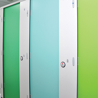 For the shower and toilet cubicles Cairngorm panels are ideal due to them being water resistant and durable. The washrooms have cubicle doors and wall panels in three different colours. The colours represent the grass, trees and blue skies of the countryside.