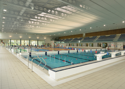 Panels are provided with an acoustic felt which is glued at the top of the joint. The open panel system chosen for the swimming pool ensures that the ceiling retains the required linear appearance whilst still offering a high degree of sound absorption.