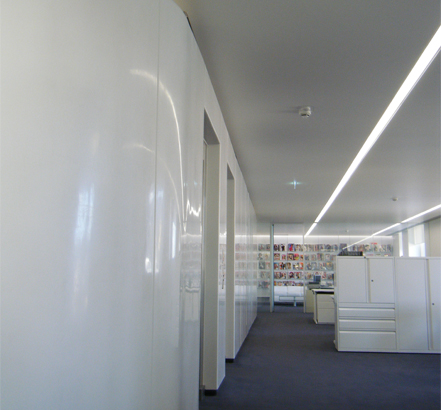 The Matt White Micro Acoustic finish was carefully selected by the architect to give an outstanding clean and smooth appearance to the office areas that not only provide approximately 82% light reflection reducing the demand for artificial light, but also making a sound improvement to the offices strict acoustic requirements. The overall layout of effortless flowing wall features together with gleaming white furniture, deep blue carpets and clean, flawless ceilings give a real sense of minimalist style throughout.