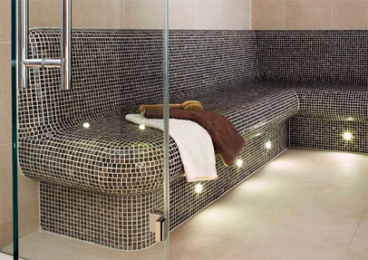 The steam room has large format tiles to the floor and walls which contrast with the glass and stone mosaic tiles used for the ceiling and benches. The ceiling has a fibre optic colour change starry sky to create the perfect chromatherapy experience. A fully programmable control panel ensures the ideal environment. Both the sauna and steam room feature sleek full glass frontages with frameless glass doors.