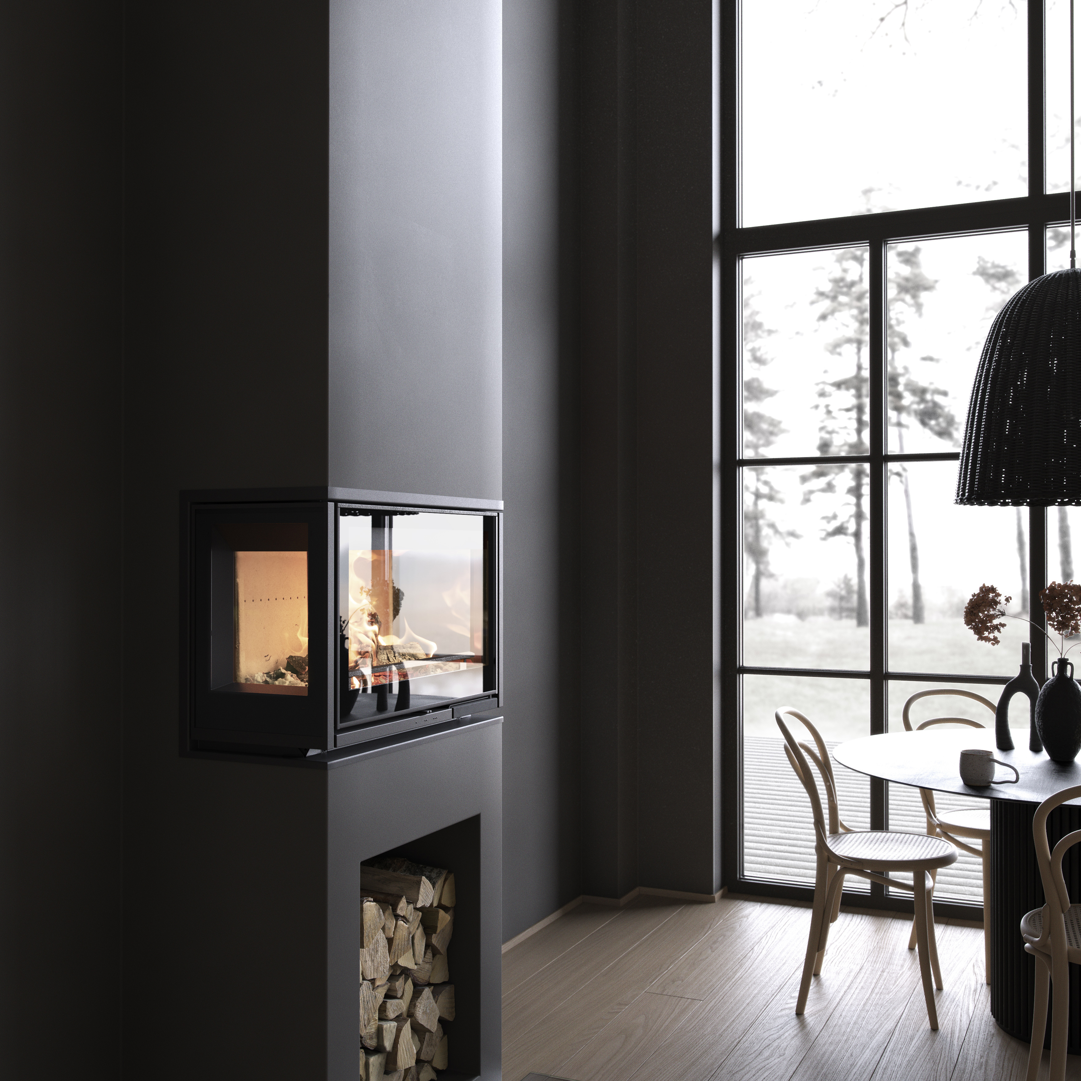 Create it to your taste and view the fire from several directions. You decide if the fire should be visible from the right, left or both sides! Thanks to the material’s thermal insulation properties, the fireplace can be placed directly against a combustible wall. Give the fireplace a robust and classic look with a cast-iron-frame door.