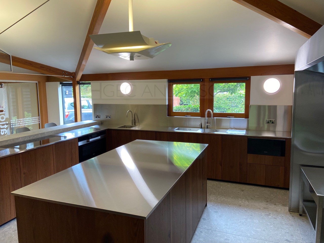 Studio 3 Kitchens approached GEC Anderson with the slightly unusual requirement for custom stainless steel worktops within a cookery display area kitchen to a food ingredient manufacturer. The design had a distinctly domestic feel, yet was required to meet the rigours and demands of a professional cooking facility. GEC Anderson stainless steel worktops appeared to fit the bill perfectly.
