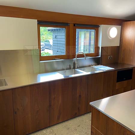 The result was a showcase environment that included a ‘breakfast bar’ viewing area; a central island; a large L-shaped worktop including a flush-mount induction hob, hide-away sockets as well as three integral sinks; a fully ventilated extraction zone for grilling. Stainless steel splashbacks were also provided behind the sink-run.