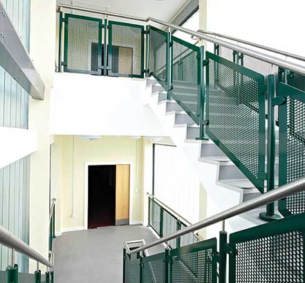 Type of works: provided Opal balusters with stainless steel handrails and polyester powder coated perforated infill panels for two staircases.
