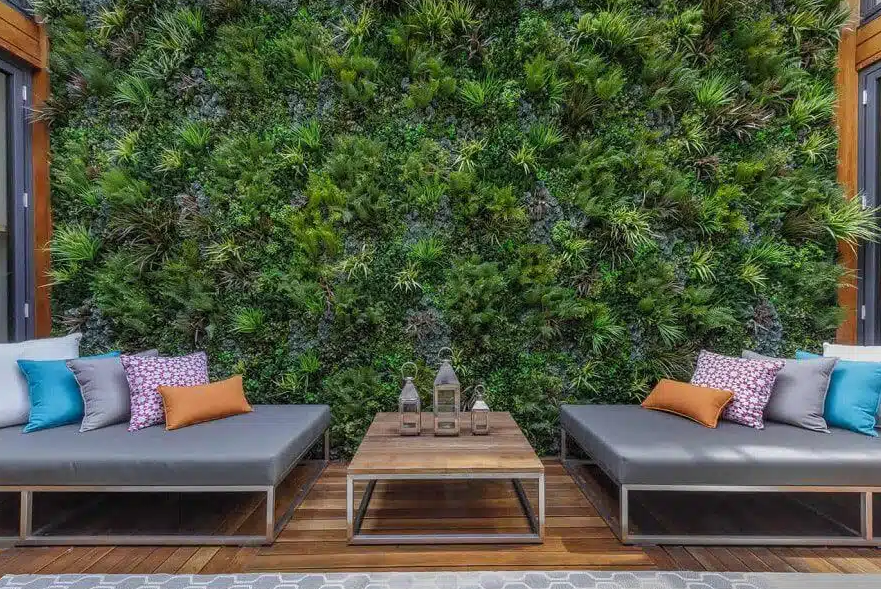 Creating a high-end faux green wall design element for a tight space, Vistafolia® rose to the challenge of dressing up the imposing feature wall of this small, enclosed courtyard in Chiswick. The client had been waiting for the right technology that would be a perfect fit for this difficult environment, which had very limited entertaining space and only enough room for a sofa and a few chairs. The client was delighted with Vistafolia® being able to provide this excellent artificial green wall vertical garden system to fulfil all of the requirements of the space.