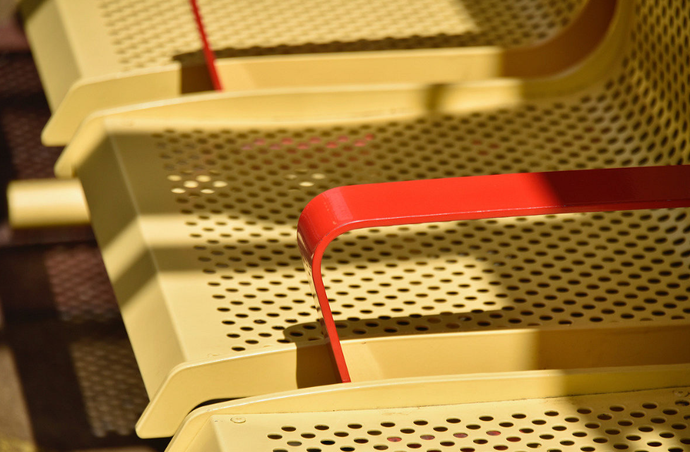 Drawing on the colours in the existing pink and yellow paving slabs, the perforated seats were made to ‘pop’ with a colour coating BS381 353 - Deep Cream and RAL3020 - Traffic Red.