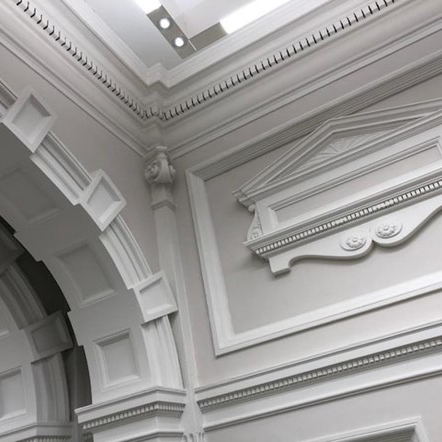 Intricate cornices and trim were carefully cut in using Dulux Trade Diamond Satinwood. Quick-drying, it comes into its own in high-traffic zones, such as corridors, stairways and access areas.