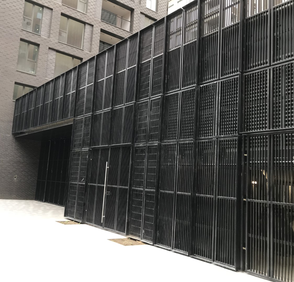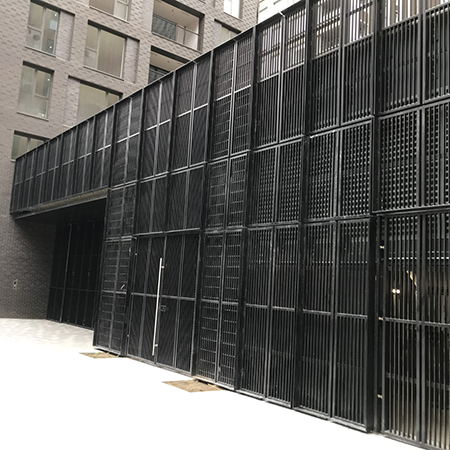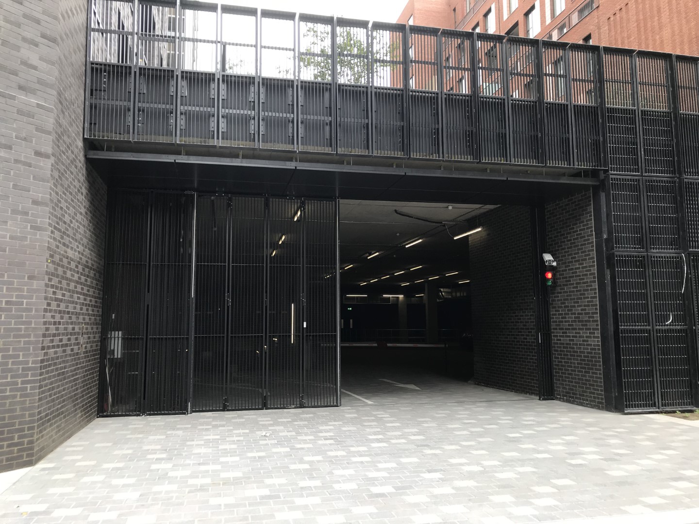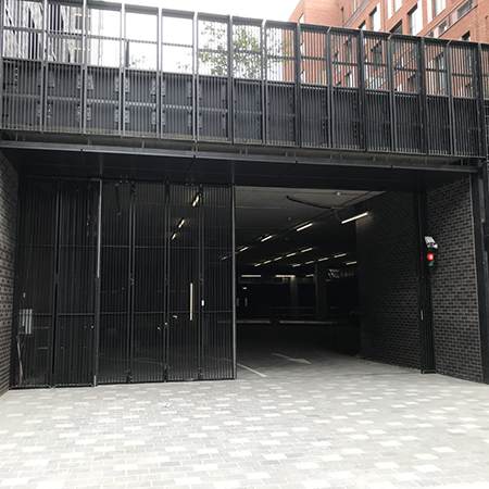 Bolton Gate assisted the Architect with the design of a large Multi-Fold Gate to the Service Bay which consists of twelve equal leaves each constructed from an SHS frame with 50 x 10mm vertical steel fins and internal mesh to prevent the ingress of birds.