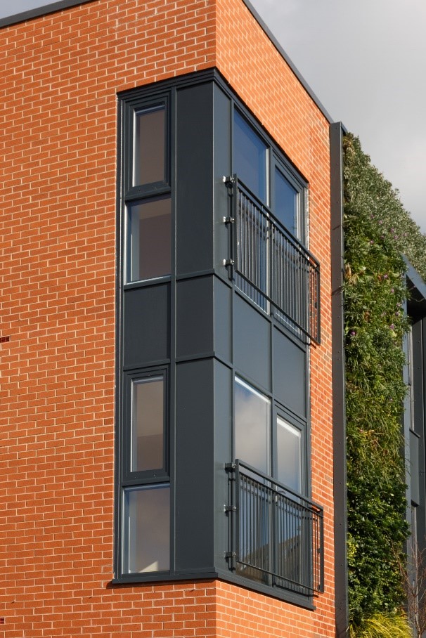 Constructed from dense concrete blocks with hollowcore flooring, the three and four-storey building is clad in a mixture of curtain walling and green wall – sections of planted walls which will be automatically fed and irrigated. The Modus windows, supplied and installed by Unique Window Systems, are tilt-and-turn so that they can be cleaned internally, avoiding the potential hazard and traffic issues of accessing them from the elevations by the two busy roads.