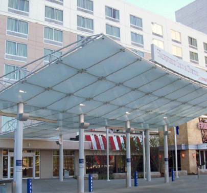 Novum was contracted to engineer, furnish and install the fan-shaped porte cochere and connecting walkway canopy at the main entrance of this downtown Indianapolis hotel. The porte cochere space frame structure elegantly tapers in depth at it approaches the cantilever tip and features a rear gutter for drainage. The canopies are clad with under slung, point supported glass panels. At each of the eight support columns, the glass is notched with aluminum water diverters to prevent leakage at the columns.