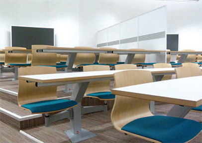 This Interactive lecture theatre as with many was installed on very shallow tiers which means it easier for the students to engage in group work activity. The seating system meant the college could install several screens at the opposite end of the room and then with the use of movable dividers could split the room to increase the usability of the seating installation.