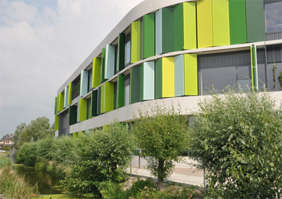 It has taken this newly developed technique and also applied it to folding screens for curved façade elements on the front of the Fioretti College in Lisse, the Netherlands. Hunter Douglas' fixed, horizontally sliding harmonica screens are not flat closing, but stand out at a slight angle in closed position.