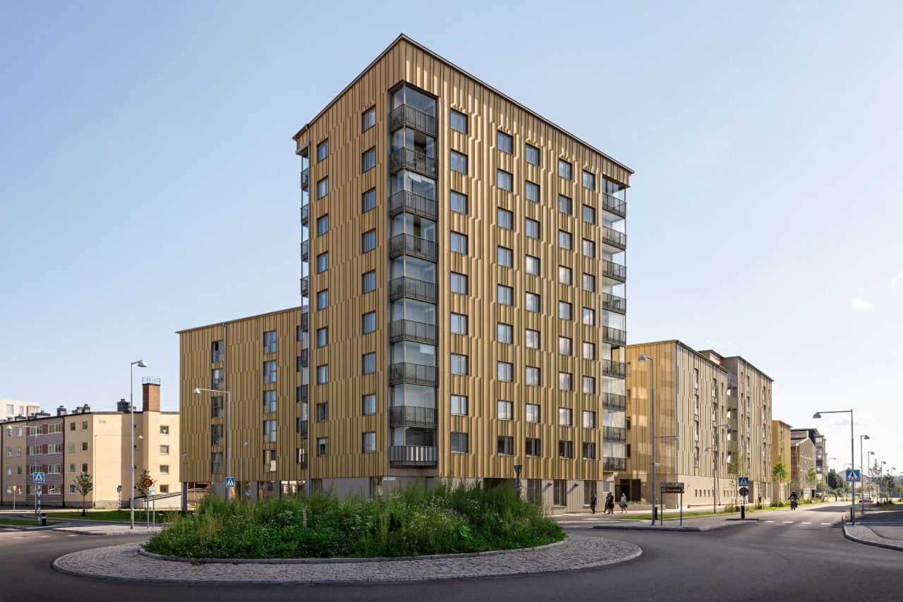 The slender, gold-toned aluminum profiles cast dynamic shadows and reflections, allowing the facades to shift character depending on the play of light and the observer’s perspective. The overall effect is a golden ensemble of buildings, aptly reflecting Skellefteå’s identity as the “golden city.”