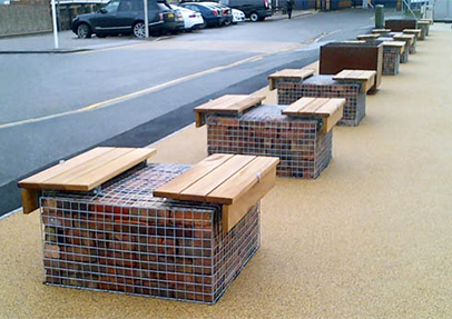 It was decided to use a combination of planters and large gabion baskets (filled with local bricks salvaged from the previous buildings on the site), both just simply placed on top of the paving. The addition of Furnitubes’ Lapa platforms to the gabions has introduced comfortable seating provision at costs that are appropriate to the temporary nature of the seating. The gabions and Lapa platforms can also be readily relocated elsewhere around the site as new building works come on stream.