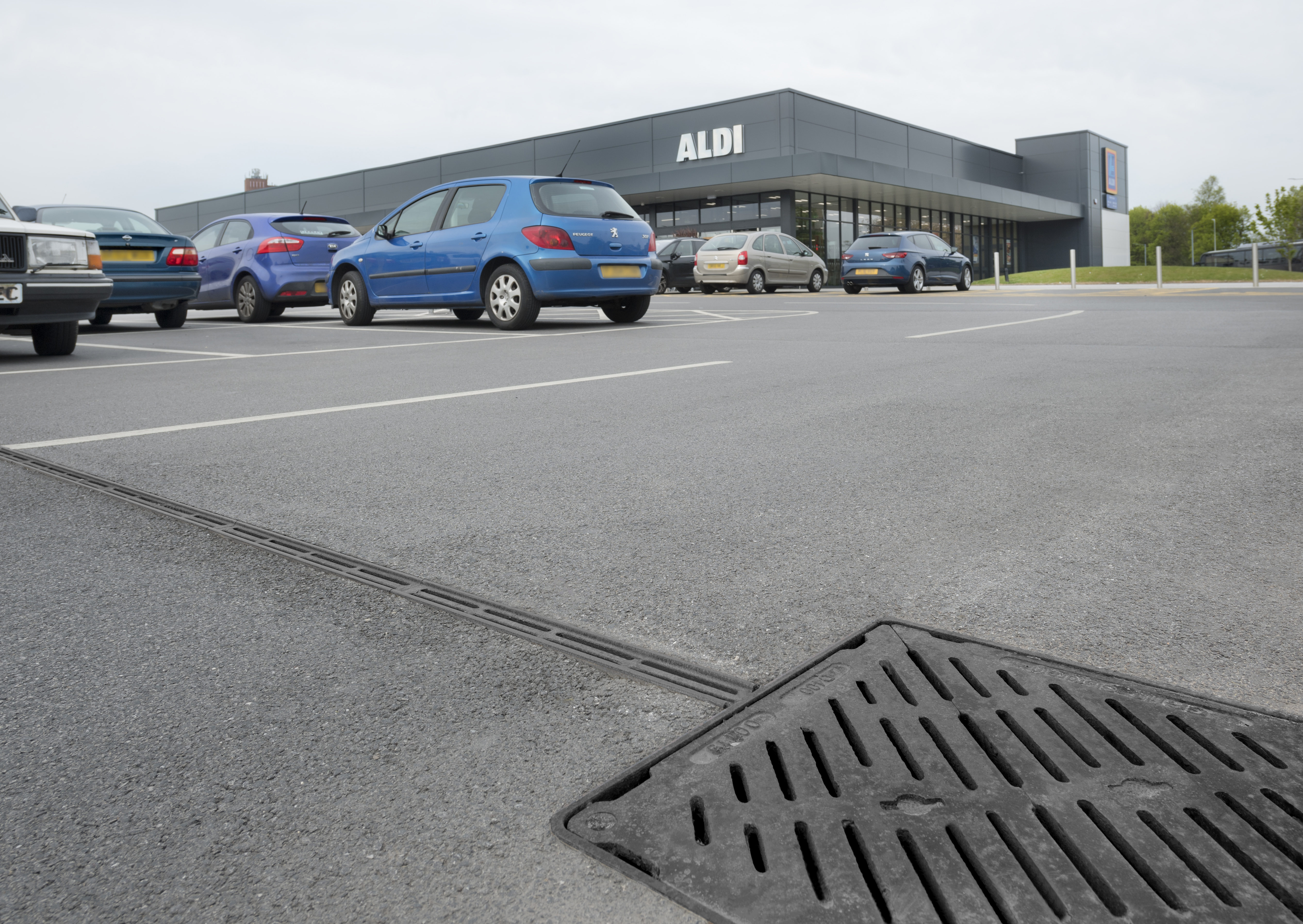 Aldi supermarket is one of the main stores that anchor the site at an impressive 18,500 sq ft. The area required major works of the external soft and hard landscaping and Gatic’s CastSlot with a Treadsafe option was specified as the slot drain for the landscaped areas.