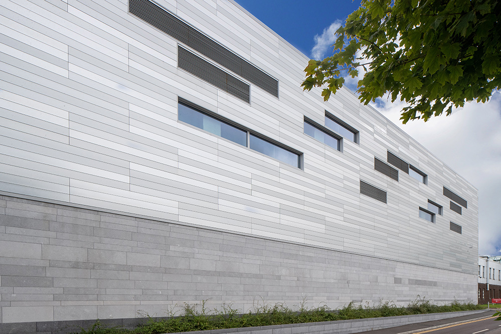 Two would be completely covered in cladding, while one would also feature stone. To add texture and variety across such large surfaces, Aliva supplied its Alu.covering® Piana F system in a range of grey finishes; ranging from standard to polished, brushed and even etched. This ‘jigsaw’ effect produced a unique end product, to help the Glandore Centre stand out for years to come.