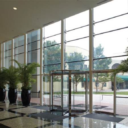 Pipe columns with vertically welded gusset plates support the glazing. The entryway includes a metal perimeter frame, two glass wing doors, two glass sidelights and an opening for a revolving door. The striking point supported glass facade creates a welcoming entrance to the office tower lobby.