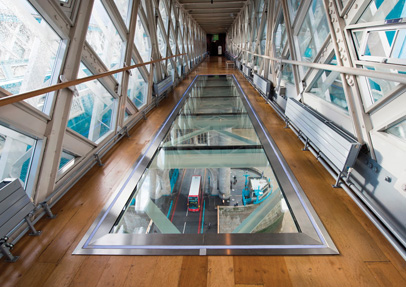 GLASSOLUTIONS won the £250,000 contract to design and manufacture the (one-way) glass, which has been inserted into the floor of each of the two 11.5 metre long walkways on the Grade I listed building.