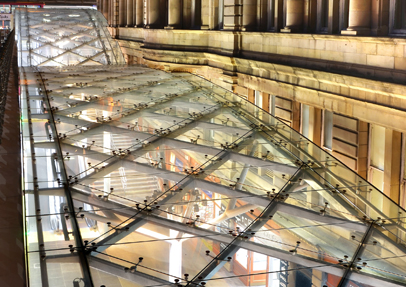 Their challenge was to balance the history and historic appeal of the stations architecture with contemporary need and modern design. As well as providing lifts and escalators, their solution entailed extensive glazing in a self-supporting fully-glazed structure utilising advanced glass technology from GLASSOLUTIONS. The result is a light-touch structure which doesnt interrupt the surroundings whilst at the same time is striking in its own right. SGG STADIP SECURIT® clear heat soaked toughened laminate safety glass was used in both the canopy and the portal screens to create a robust, safe and attractive glazed feature. The 21.5mm glass used in the canopy comprised triangular glass panels, bolted to steelwork via cast stainless steel SGG SPIDERGLASS fixings for which specially designed brackets were painstakingly designed.
