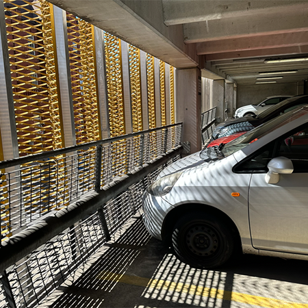 Specifying an expanded mesh that could incorporate a tailored, screen-printed finish gave the NHS Trust a beautiful, unique facade that offers clear car-parking signposting to visitors. Because of the gradient of the building, the fixing system had to be independent of the frame. Aliva UK’s technicians designed a bespoke solution that allowed installers to anchor brackets at slab level and span a vertical structural mullion from slab to slab. This created a cladding zone of 137mm to allow for the potential impact of a car hitting the restraint barriers on the perimeter, further enhancing security.