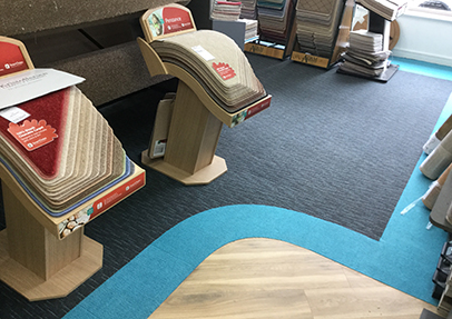 Kristofferson Carpets and Flooring chose 60m2 of Array Peacock with complementary Broadrib in Peacock for the refurbishment of its Newtongrange showroom near Edinburgh, after seeing samples of both ranges.